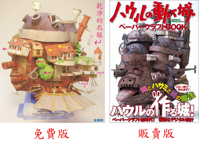 不過根據我比較過販賣版的模型和免費版的,發現兩者其實差別蠻大的,仔細看就可發現其中的差異(尤其是那個舌頭)。販賣版的顏色灰暗單一,而免費版的鮮明可愛。在看看免費版的不但有很多植物,片尾的小花園,重點就是那排洗好的衣服。我想販賣版的是以最初的移動城堡當模型,而免費版的是以片尾在空中飛的快樂城堡作為模型吧。等到DVD出了就可以好好比對比對了(這句其實是敗家宣言)。
