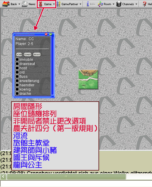 開一個新遊戲局,或是加入遊戲,第一件事當然是確認你玩的是哪一個遊戲。標題不是說Carcassonne了嗎?不過Carcassonne有很多擴充,要玩什麼擴充,在遊戲開始之前就要決定好了。點上方的Game即可跳出遊戲控制板。