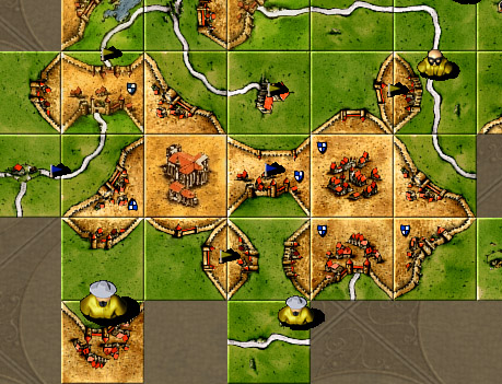 以上是我在BSW的Carcassonne中玩過最高分的城,包含旅館與主教擴充,其中城內的主教城是對手為了害我幫我拼的,想不到最後居然被我完成了,加上那一堆盾牌,單城就有60分阿。真是賺翻了。
