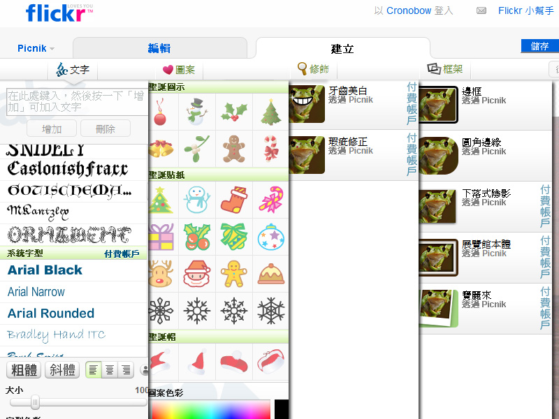 其他四個項目的功能,也是有付費和免費的項目(修飾無免費) 。值得一提的是文字功能並沒有辦法顯示中文。這關係到字體本身沒有中文。所以除非Picnik增加中文字體,不然應該是無解了。